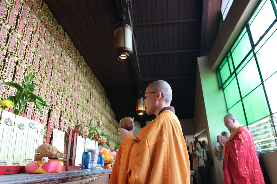 The temple includes two memorial halls for ancestral tablets for the names of deceased loved ones and generous donors. As a support for those in the other world, there is a gold-lacquered figure of Ti-Tsang Bodhisattva in both halls.